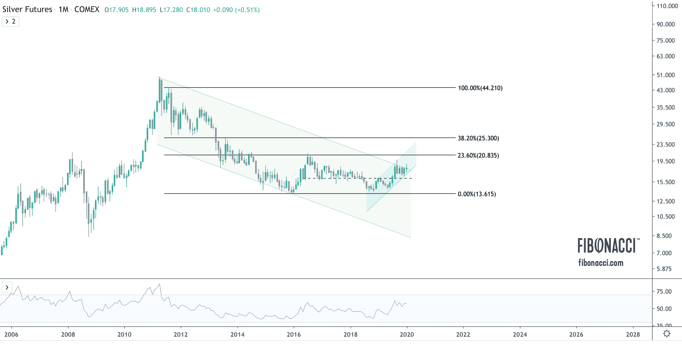 The monthly gold chart (above) has honored the 38.2% and 61.8% fibonacci retracements religiously over the last nine years, which makes this month’s recent breakout all the more significant. In the chart below, you will note that I drew the beginning of my Fibonacci levels from the secondary high in 2011, and not the primary high (the absolute peak). In this case, the year long shelf following the peak is an area of much greater significance and the better location to start the ratios. Thus, the recent break of 61.8% is all the more notable.