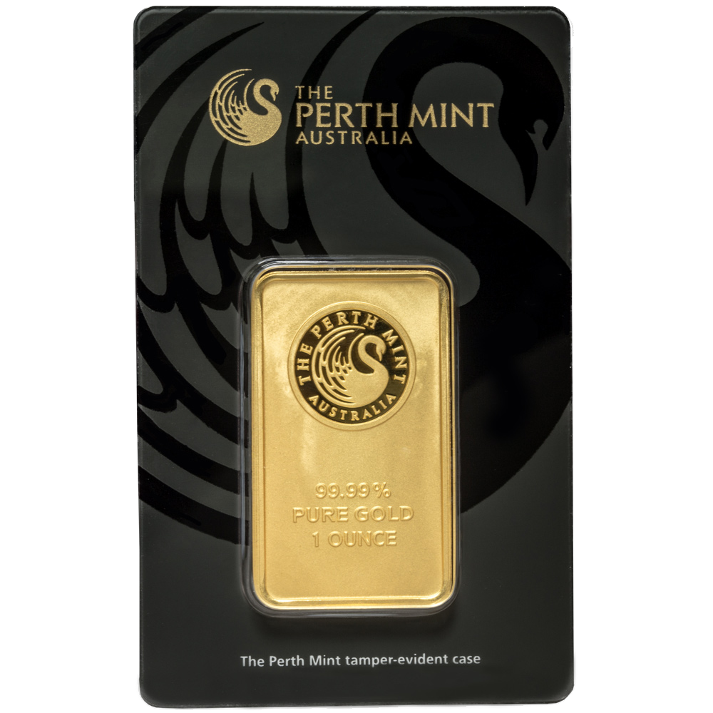 Recognized for the remarkable quality of their gold products, the Perth Mint is the oldest currently operating mint facility in Australia. The 1-ounce Perth Mint Gold Bars are IRA approved with a gold purity of .9999 and guaranteed by the Commonwealth Government of Australia. To ensure security and guarantee authenticity, each bar is packaged and sealed in a Perth Mint tamper-evident assay card, which includes a unique designated bar number and the signature of the chief assayer. In the upper half of the bar’s obverse, a circular stamp declares “The Perth Mint” across the top with “Australia” nestled on the bottom of the ring. The swan of The Perth Mint logo sits ensconced in the center of these words. On the lower half of the obverse, the bar’s purity, metal content, and weight are identified in raised lettering. A lipped edge rims the rectangle on both faces. Patterned across the matte gold of the reverse is the well-known Australian Kangaroo in high-shine, positioned toe-to-tail in diagonal lines.